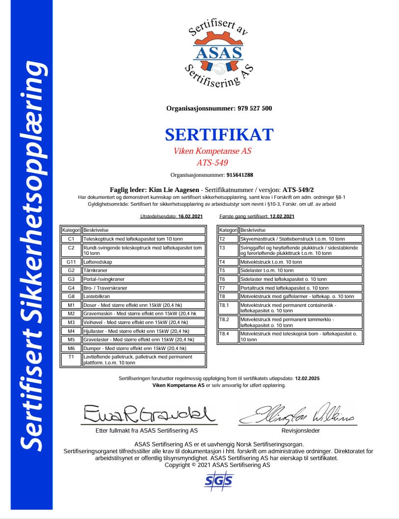 Viken Kompetanse AS er registert i ASAS som godkjent bedrift for sertifisert sikkerhetsopplæring.